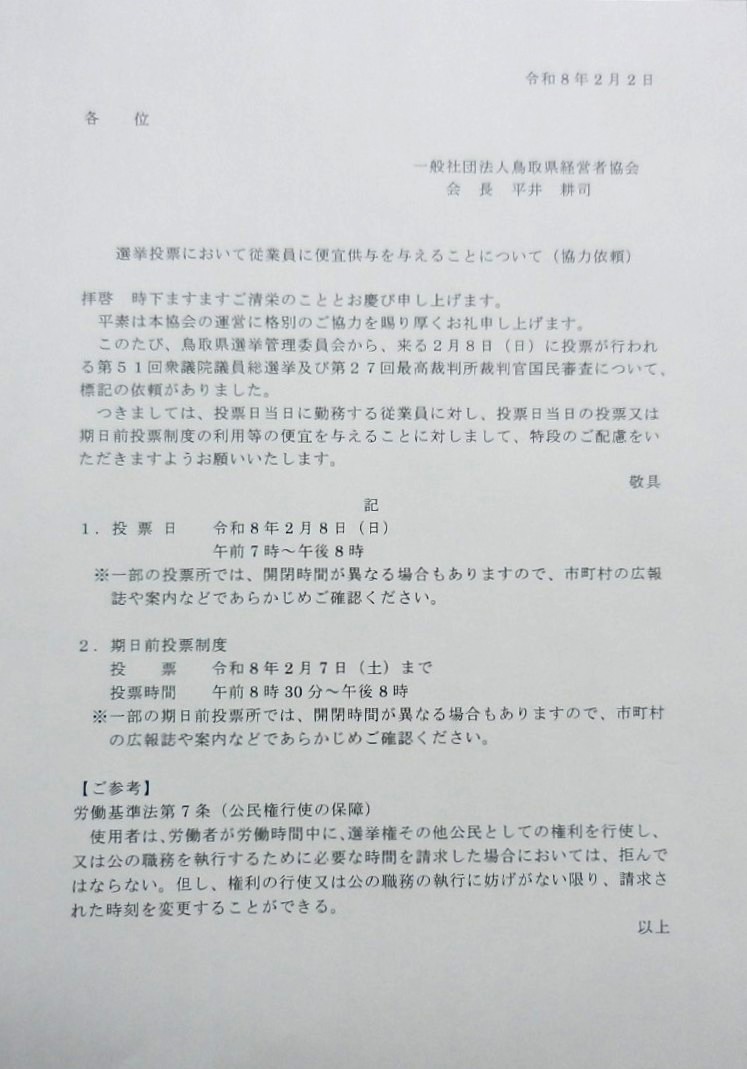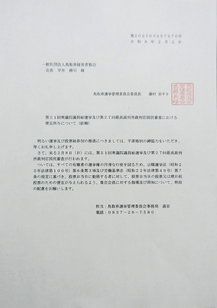 【鳥取県選挙管理委員会より】第51回衆議院議員総選挙及び第27回最高裁判所裁判官国民審査における便宜供与についての依頼がありました。
